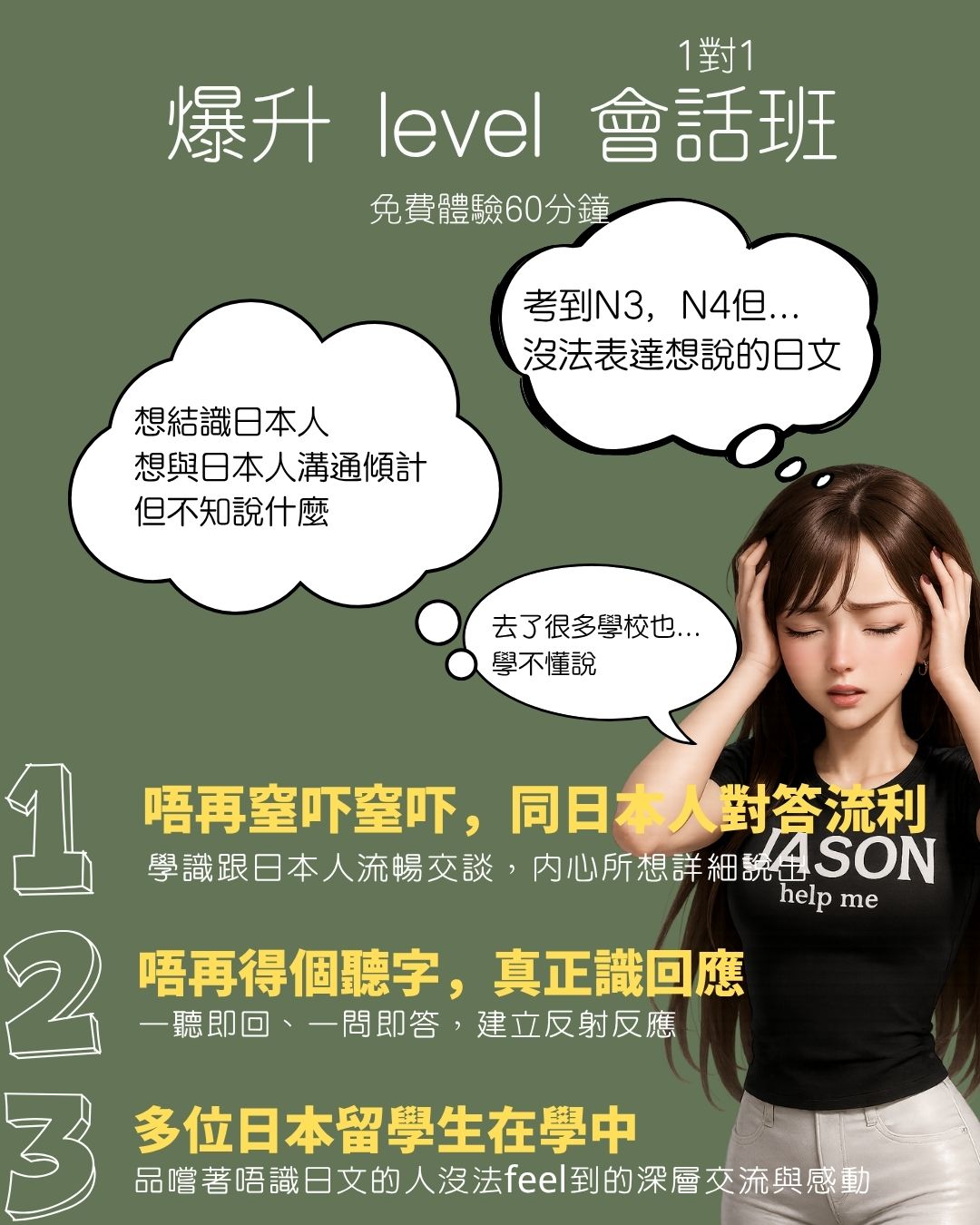 JAson日語【會話改良】課程是一個針對日語會話能力增強/改善的課程。